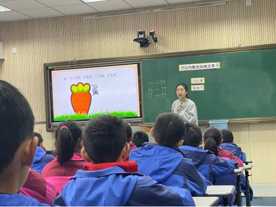 首先,到达小学之后,校方安排了潘静静老师招待了23名研究生及陈老师前往了小学的微格教室,研究生们在微格教室观摩了数学课和英语课,分别为潘莹莹老师上了《万以内加减法的复习课》和实习研究生徐聪聪的《DINNER’S READY》。小教专业的研究生们都专心地关注着两位老师精彩的课堂,每位研究生都能热情地参与到本次课堂教学见习活动中。
