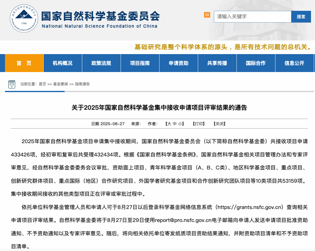 2025年8月27日,国家自然科学基金委员会正式公布2025年度集中接收申请项目评审结果,h漫