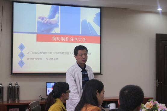 11月14日(星期四)下午1点半,在博观楼401会议室开展了简历制作大赛分享大会,出席会议的有浙江鼎宏保险销售有限公司综合管理部人力资源总监夏冰、h漫
