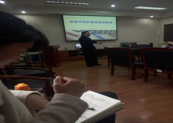 最后压轴的是留学美国归来的余斌老师为大家带来的清新有趣的“和而不同的美国高等教育”。正如余老师自己所说,由他带来的归国汇报真是“笑声不断”,同学们从老师的申请访学之路到周游大学之旅再到美国高等教育,在他的讲解中不仅感受到的是美食、美元、美人,更有此次访学中最重要的高等教育。