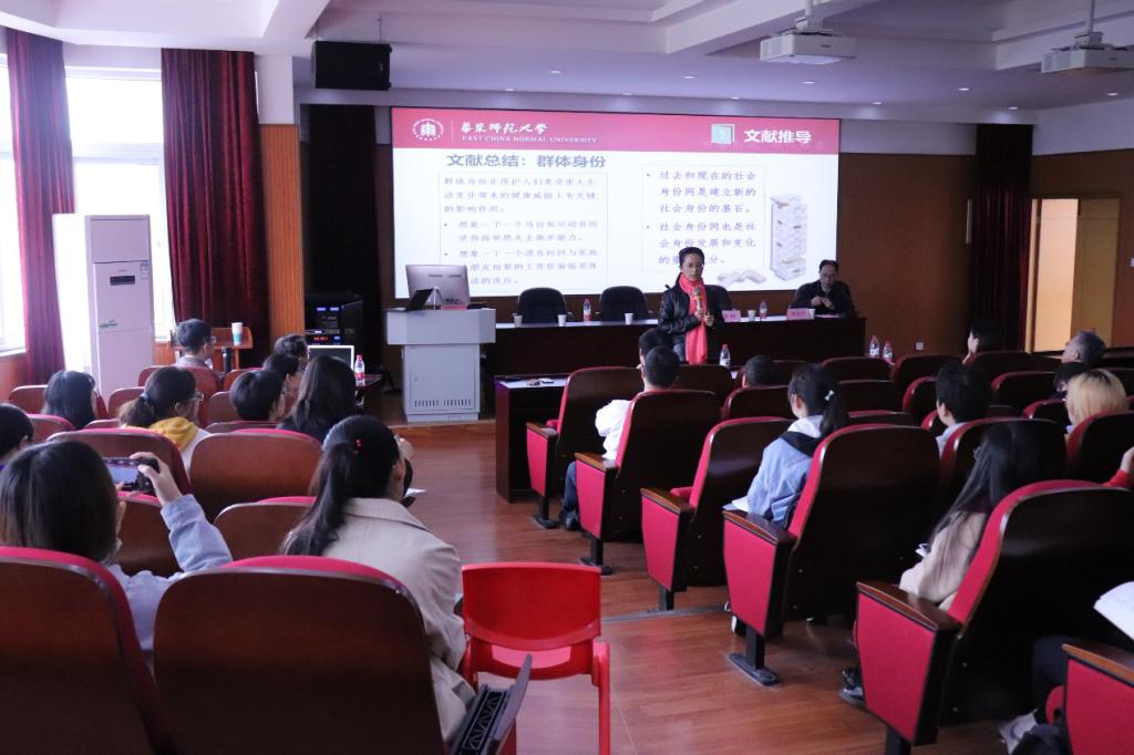 高峰论坛以主题报告的形式展开,共包含四个主题报告。报告一由华东师范大学心理与认知科学学院崔丽娟教授以“群体身份的社会医治之路”为题进行。崔丽娟教授从个体的群体身份出发,提出社会认同对个人发展的重要影响,认为融入群体能够满足个体归属的需要,并能帮助个体形成积极的自我概念。此研究对当今社会的特殊群体——流动儿童社会适应性的改善至关重要。崔丽娟教授进行了精彩的报告,让与会的学者与学生对原创性的学术研究有了更深入的认识。