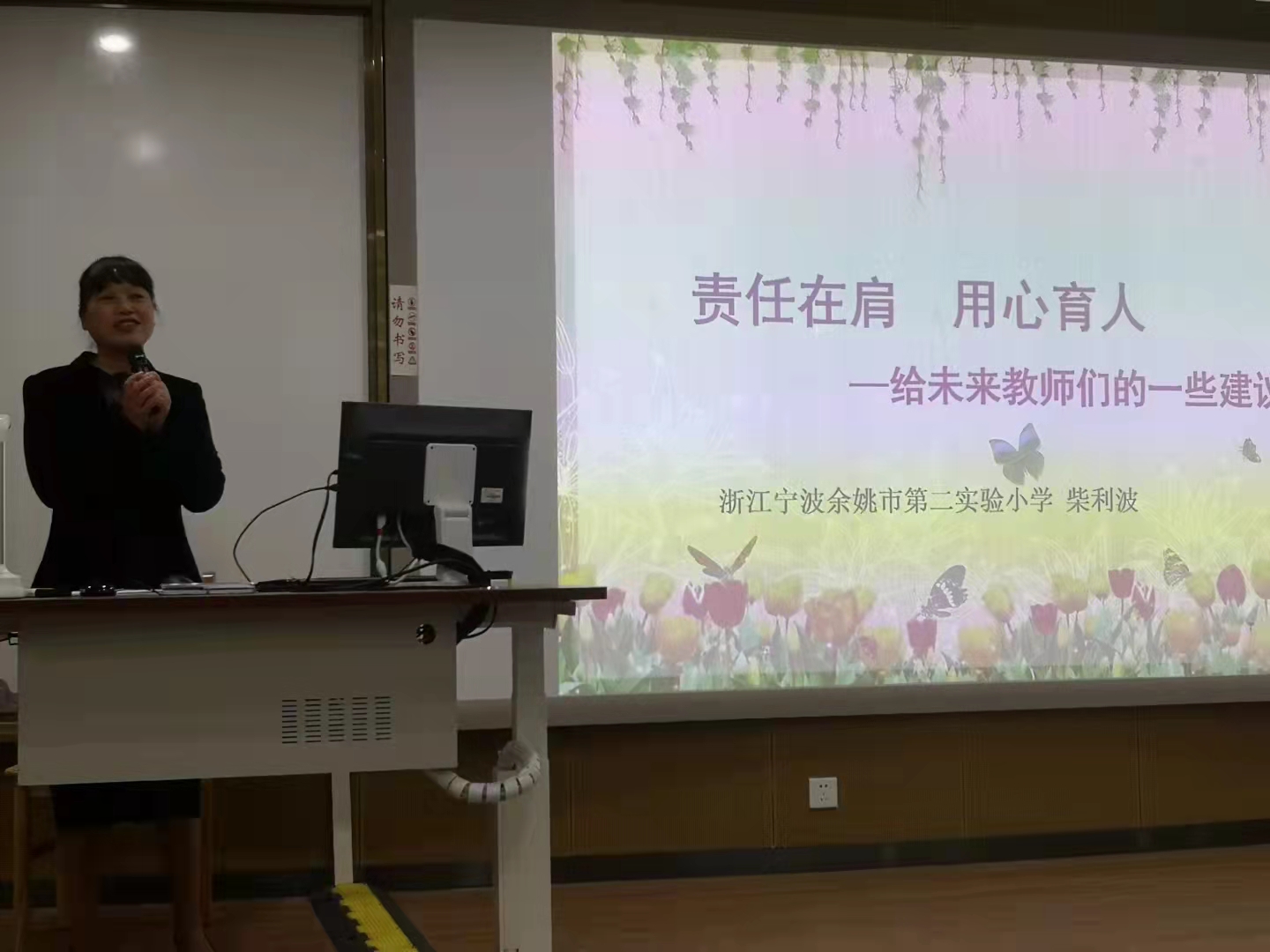 柴利波老师是宁波余姚市第二实验小学校长,宁波市人大代表,高级教师。曾荣获宁波市第三届数学名师,宁波市第六届名校长,浙江省优秀教师等多项荣誉。本次讲座中,柴校长由浅入深,开始便抛出三个问题:“教育是什么”“教师是什么”“教师要干些什么”。围绕着这三个问题,柴校长仔细阐述了关于教育的概念和切身感想,举出多个小学教学中遇到的各类问题,点出作为教师应对课程标准和教材读通、读懂、读明白,令在场师生收获良多。