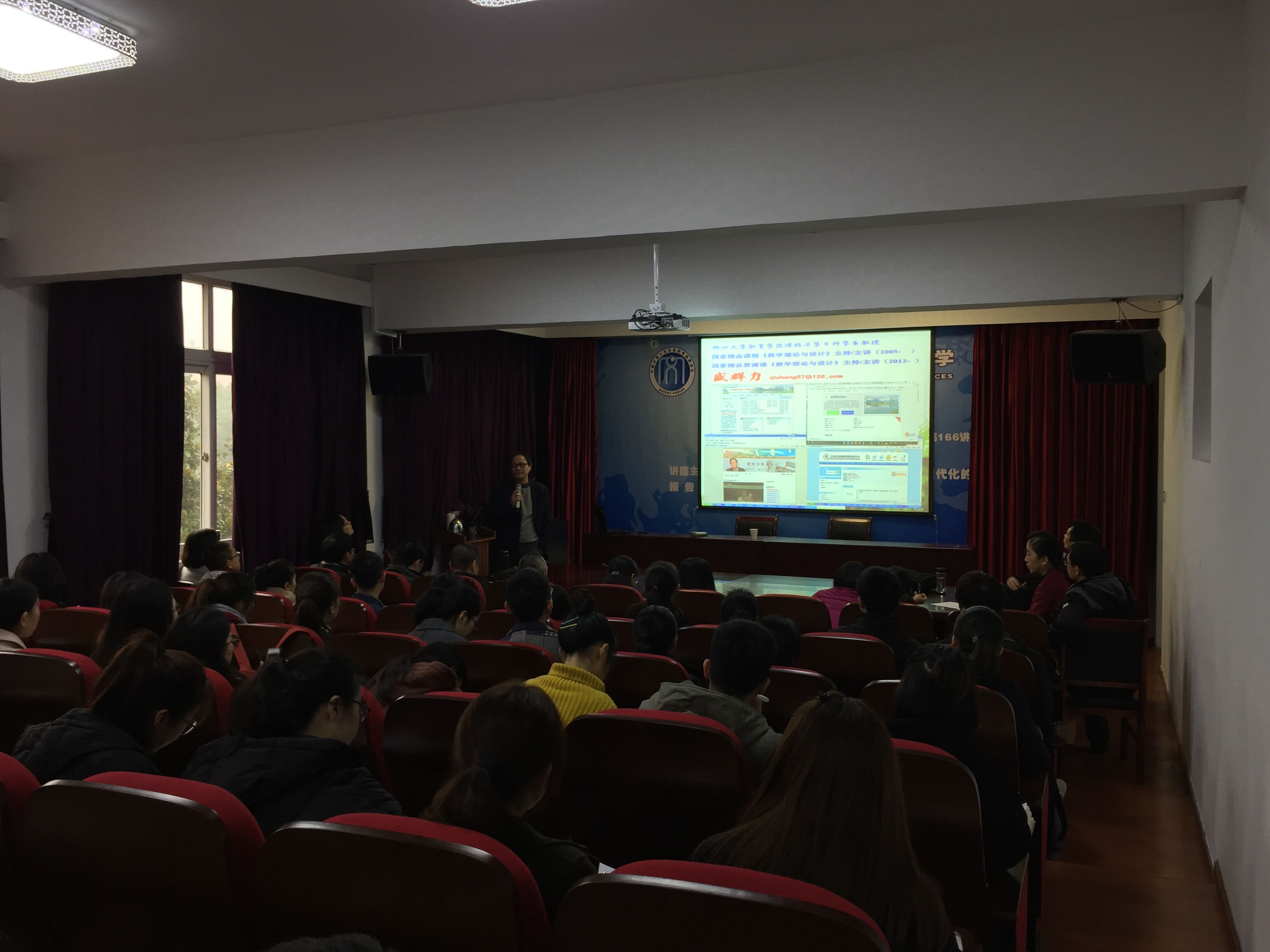 在讲座最后,盛教授和在座师生进行了互动,大家从讲座中都深受启发。今后的教学开展和设计都应该本着建构意义学习的原则来进行。一切以学生的发展作为教学内容设计的核心和重点。最后大家以热烈的掌声对盛教授的到来表示感谢。讲座也在热烈的掌声中结束了。