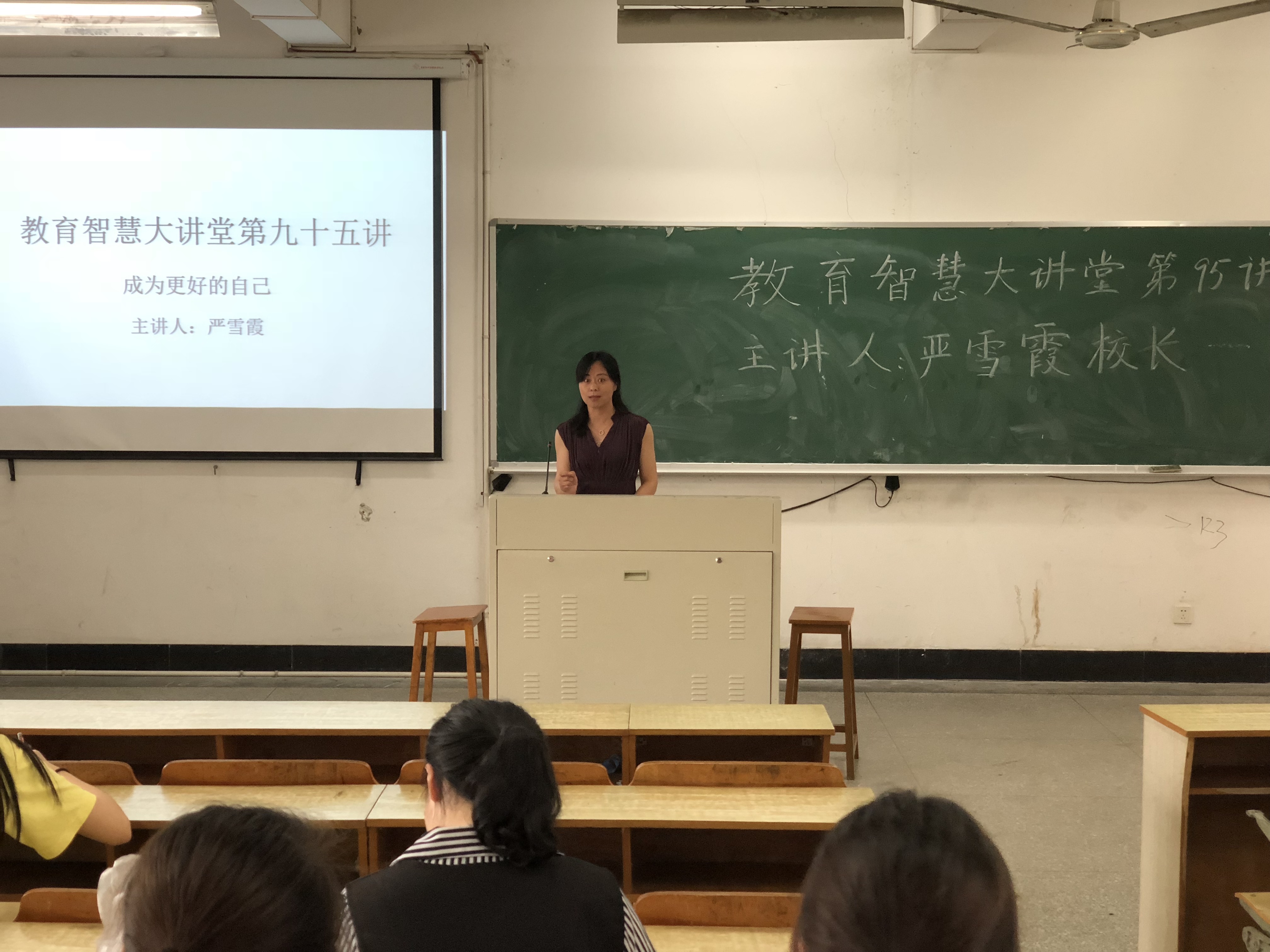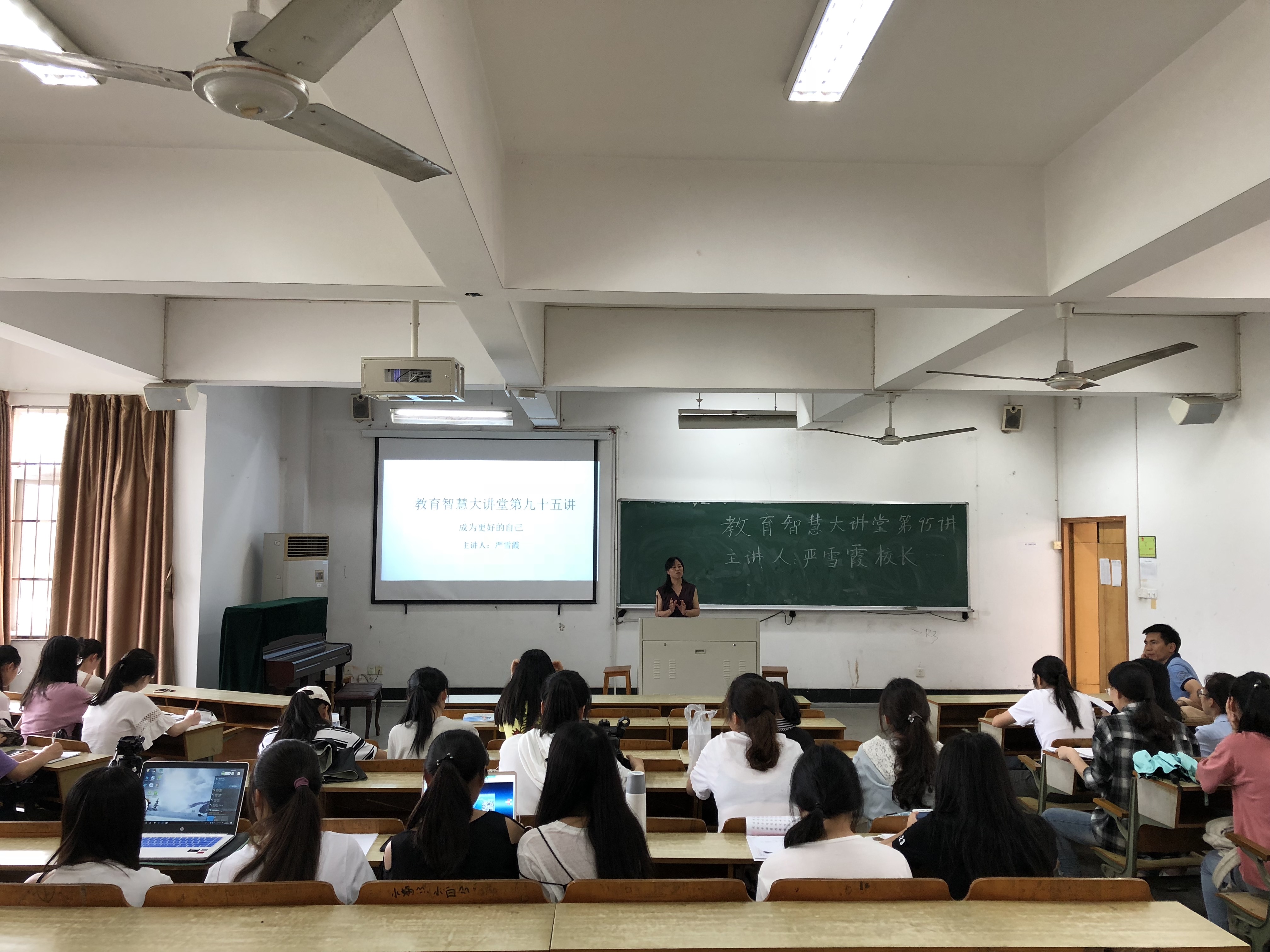 “智慧大讲堂”第九十五讲在实验楼111准时开讲。讲座邀请到北仑蔚斗小学严雪霞校长主讲。15,16以及17级数学方向的学生到场聆听。讲座由学院教学副院长陈柏华老师主持。