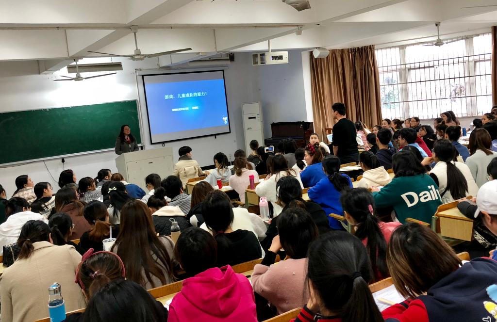 学前教育专业16、17、18级学生前来听讲。讲座由学前系主任汪洁萍老师主持。