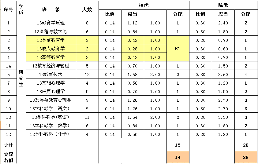 3、校优、院优各班名额拟定分配如下: