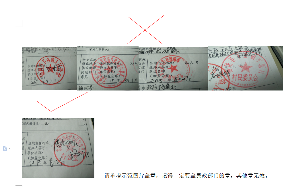 3)不属于(2)中五类生的需凭借乡镇以上民政部门公章,如果因为特殊原因章不符合要求,可向学工办负责老师说明情况商定,学院按照“实事求是”原则予以认定。(注:公章必须为民政部门公章,其他如街道、社区等公章均无效)请参考下图示范图片