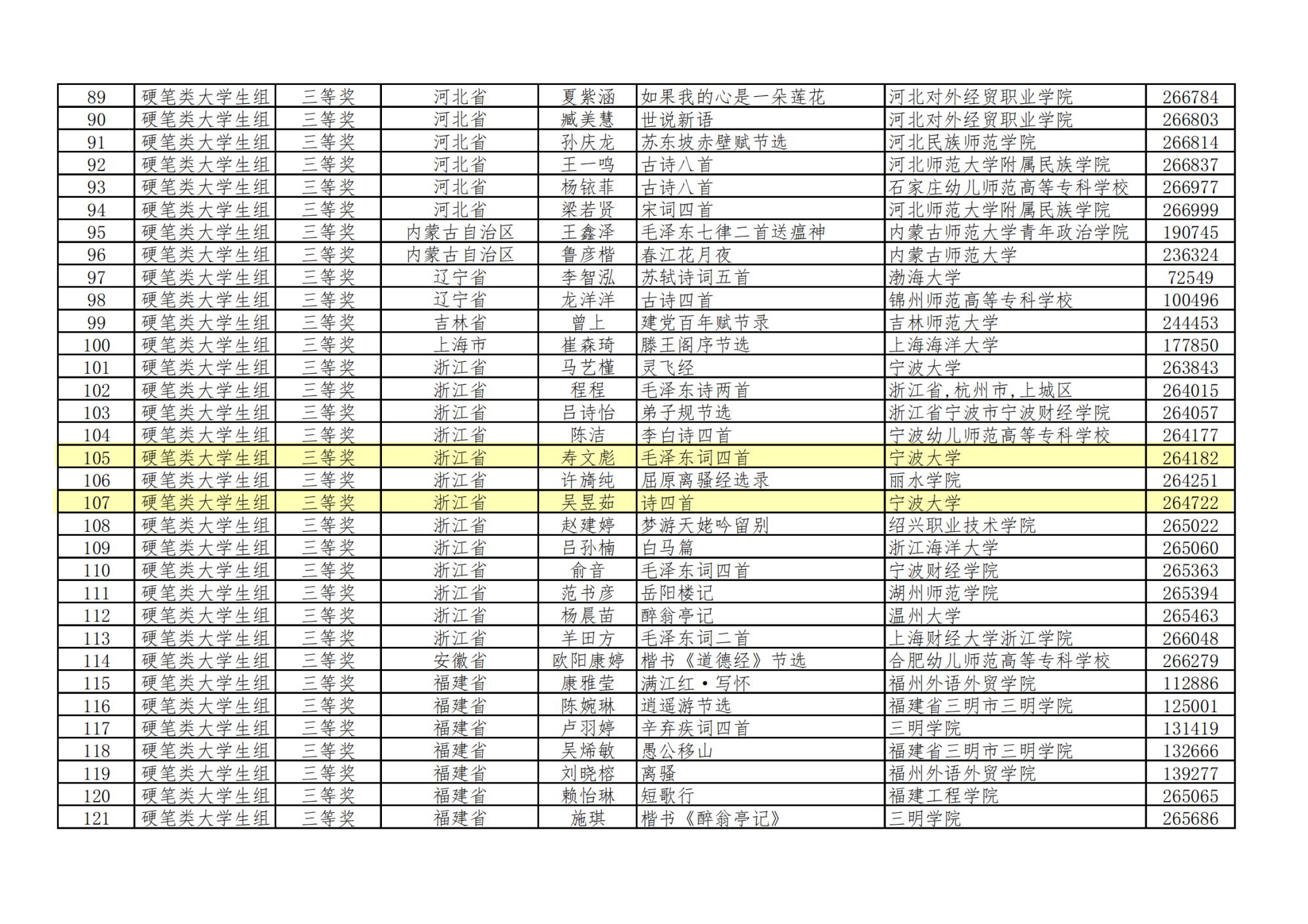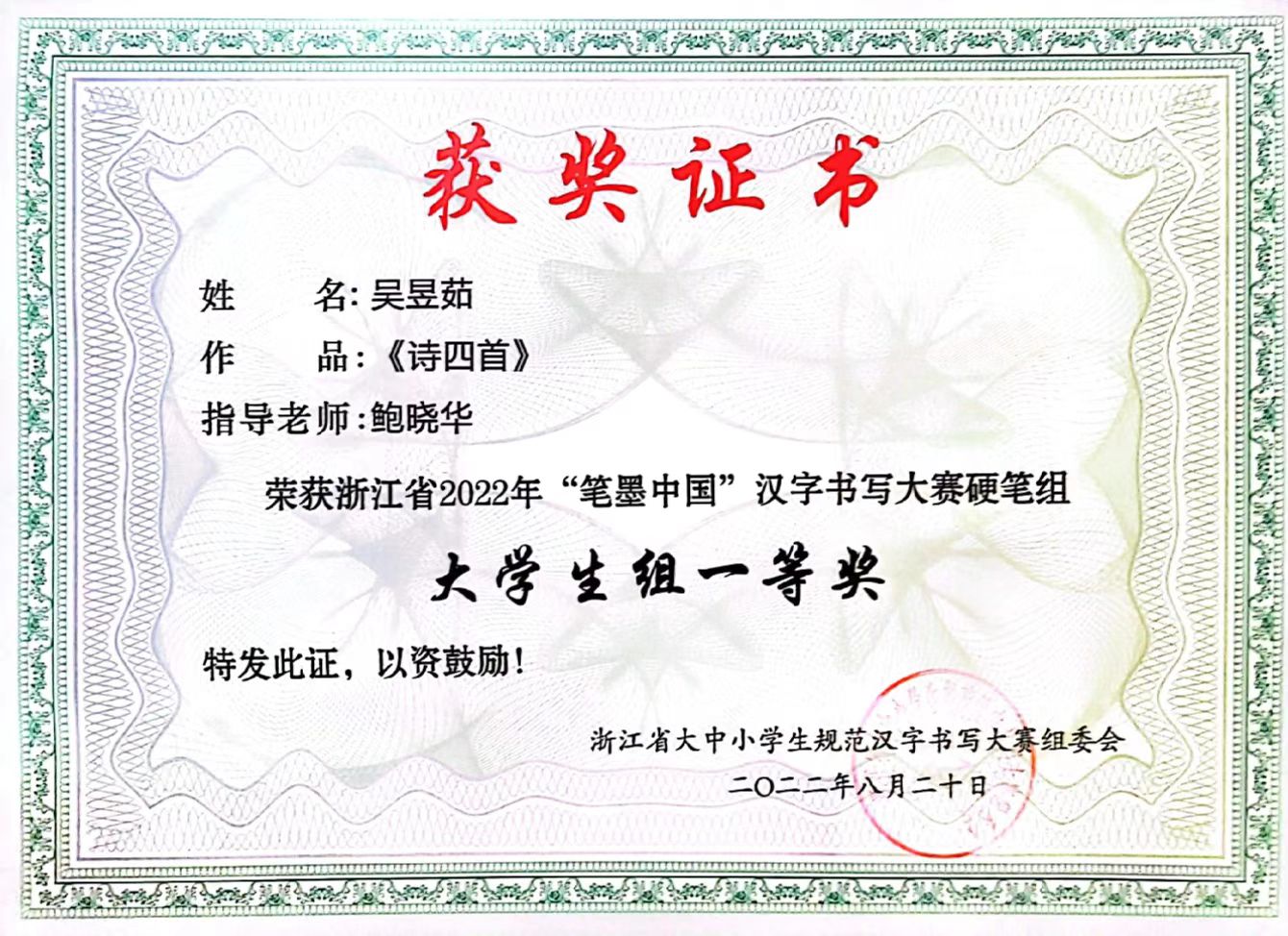 4名学生在全国数万件参赛作品中脱颖而出,在评选出的大学生组硬笔书法一、二、三等奖和优秀奖共313人中(浙江高校占27人),h漫